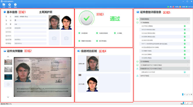 主界面由5个部分组成,区域1为从证件读取的基本信息;区域2为证件的图像(白光图、红外图及紫外图);区域3是查验结果概览区域;区域4是信息对比区域,用于显示具体查验项所关联的信息;区域5是证件查验的检查点及分类。
