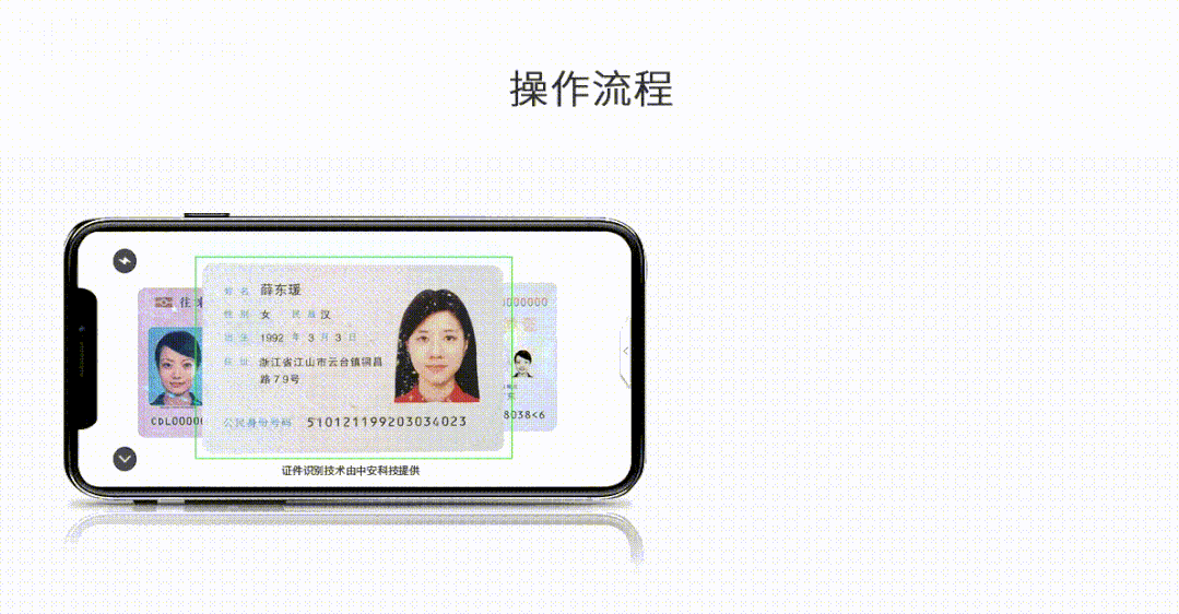 通过移动端SDK等多种形式使用,支持视频流识别,像扫二维码一样轻松识别证件信息,识别速度<1s。